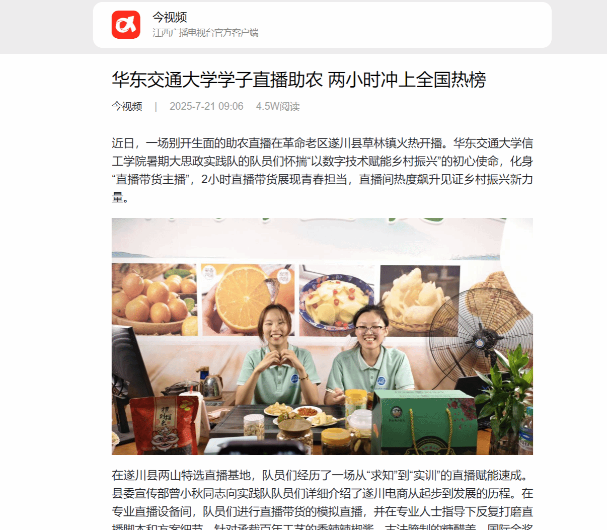 当晚,在草林镇两山优选体验馆(红圩·映山红茶馆),实践队队员们秒变“青春主播”,面对镜头,他们将精心准备的内容倾情呈现:从承载百年工艺的香辣辣椒酱,到古法腌制的爽口糖醋姜;从风味独特的浸坛辣椒、浸坛蒜薹,到香甜软糯的月亮粑;从荣获国际金奖的狗牯脑茶,到别具风味的甘草瓜子……短短2小时的首秀,直播间热度节节攀升,一度冲上抖音生鲜带货榜全国第7名,让遂川特产从云端走向全国。