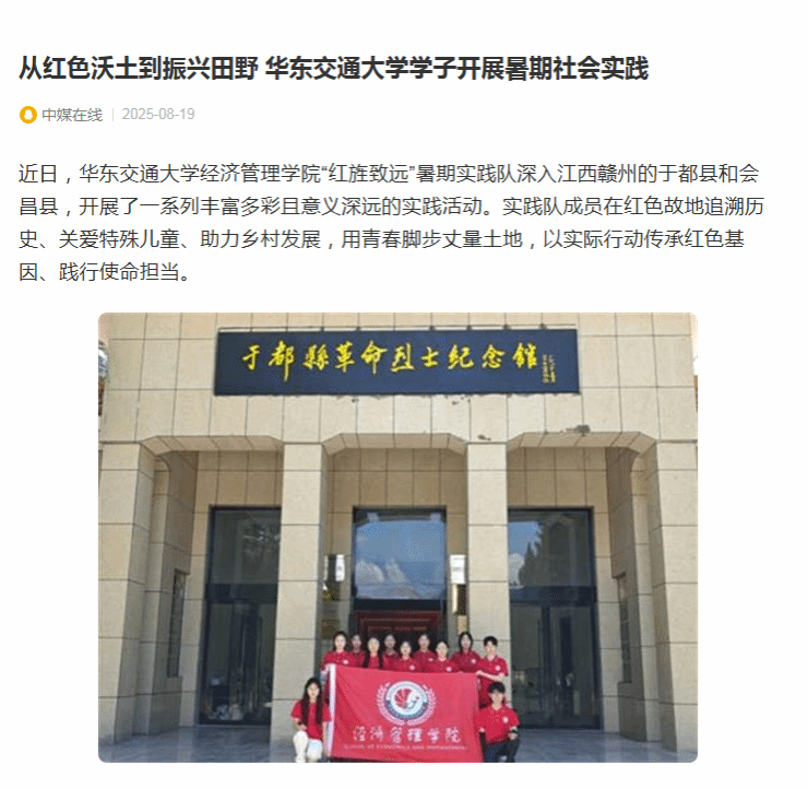 近日,WilliamHill中文官方网站经济管理学院“红旌致远”暑期实践队深入江西赣州的于都县和会昌县,开展了一系列丰富多彩且意义深远的实践活动。实践队成员在红色故地追溯历史、关爱特殊儿童、助力乡村发展,用青春脚步丈量土地,以实际行动传承红色基因、践行使命担当。