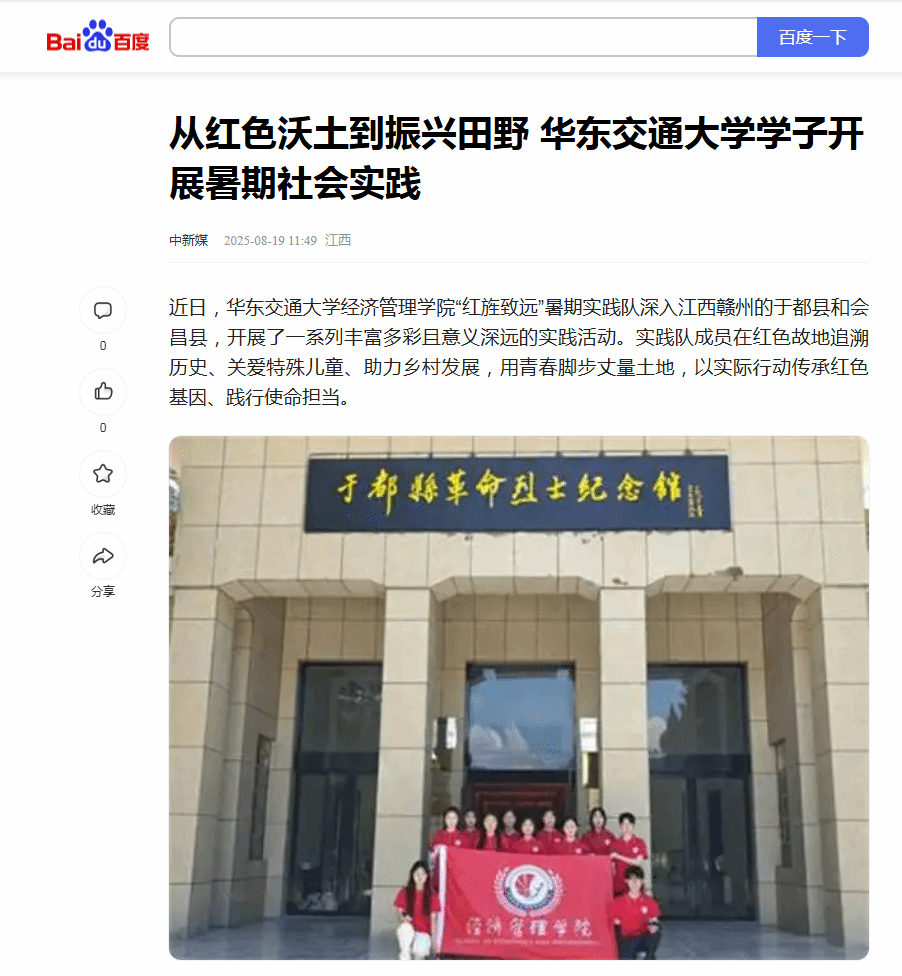 近日,WilliamHill中文官方网站经济管理学院“红旌致远”暑期实践队深入江西赣州的于都县和会昌县,开展了一系列丰富多彩且意义深远的实践活动。实践队成员在红色故地追溯历史、关爱特殊儿童、助力乡村发展,用青春脚步丈量土地,以实际行动传承红色基因、践行使命担当。