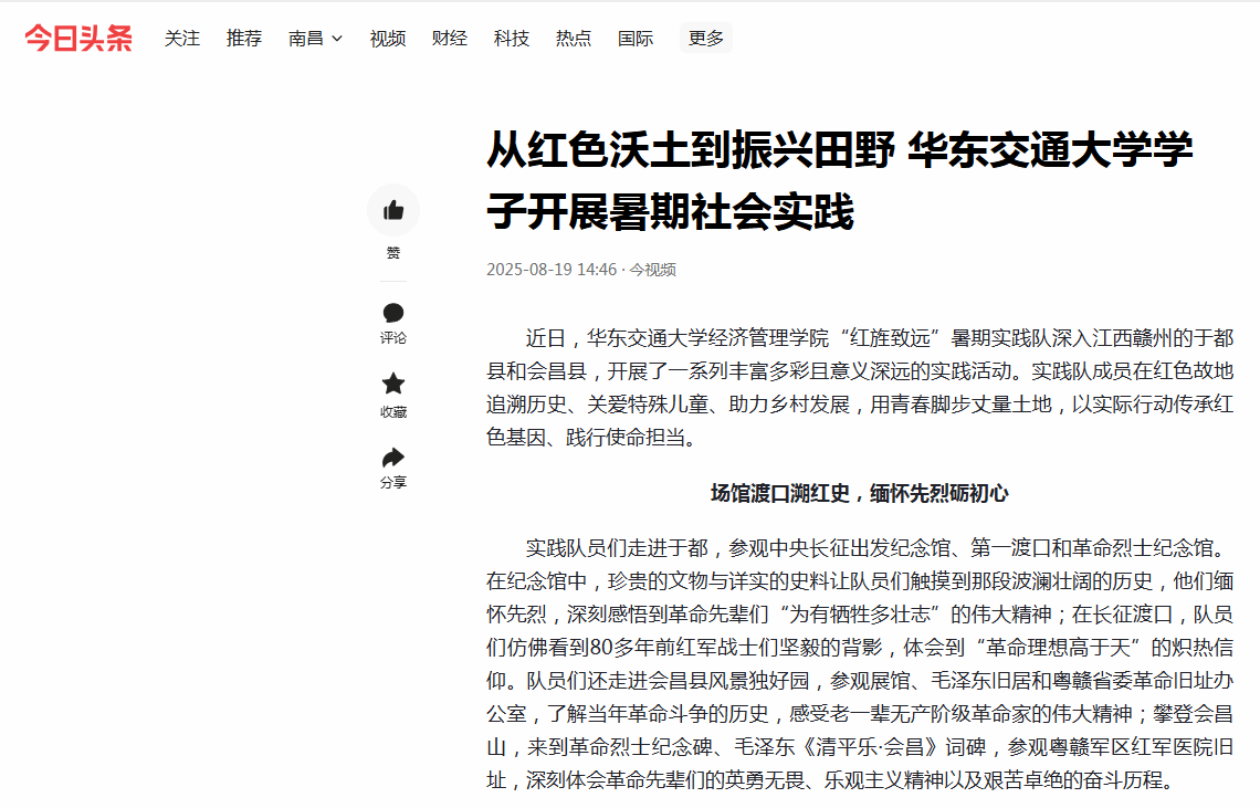 近日,WilliamHill中文官方网站经济管理学院“红旌致远”暑期实践队深入江西赣州的于都县和会昌县,开展了一系列丰富多彩且意义深远的实践活动。实践队成员在红色故地追溯历史、关爱特殊儿童、助力乡村发展,用青春脚步丈量土地,以实际行动传承红色基因、践行使命担当。