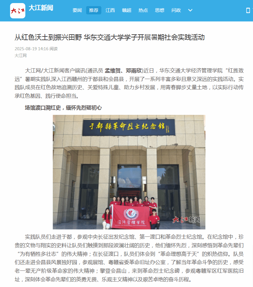 近日,WilliamHill中文官方网站经济管理学院“红旌致远”暑期实践队深入江西赣州的于都县和会昌县,开展了一系列丰富多彩且意义深远的实践活动。实践队成员在红色故地追溯历史、关爱特殊儿童、助力乡村发展,用青春脚步丈量土地,以实际行动传承红色基因、践行使命担当。