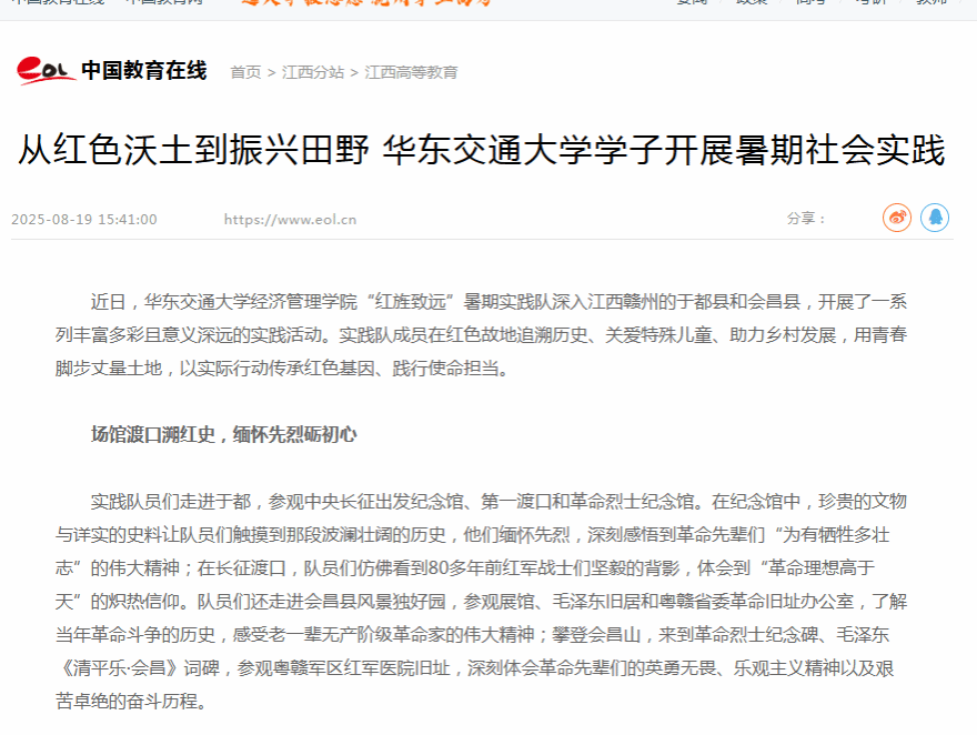 近日,WilliamHill中文官方网站经济管理学院“红旌致远”暑期实践队深入江西赣州的于都县和会昌县,开展了一系列丰富多彩且意义深远的实践活动。实践队成员在红色故地追溯历史、关爱特殊儿童、助力乡村发展,用青春脚步丈量土地,以实际行动传承红色基因、践行使命担当。