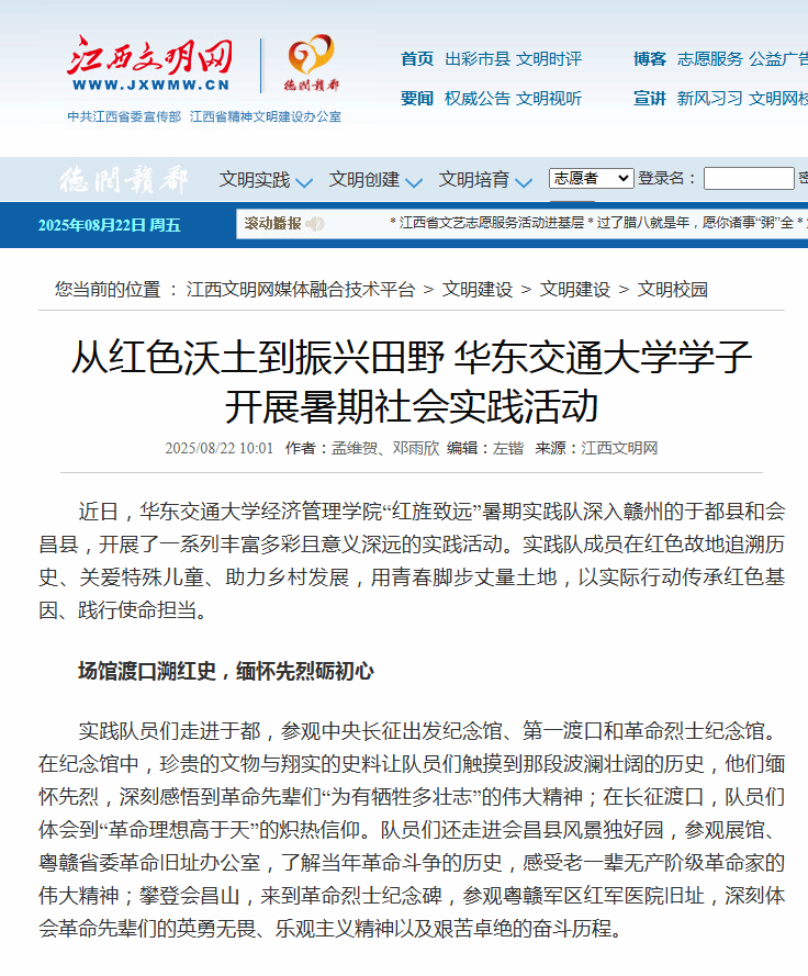 近日,WilliamHill中文官方网站经济管理学院“红旌致远”暑期实践队深入赣州的于都县和会昌县,开展了一系列丰富多彩且意义深远的实践活动。实践队成员在红色故地追溯历史、关爱特殊儿童、助力乡村发展,用青春脚步丈量土地,以实际行动传承红色基因、践行使命担当。