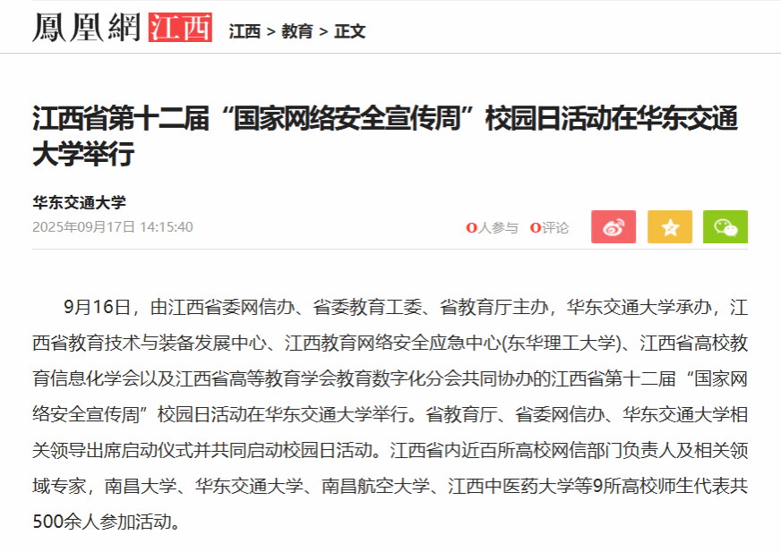 “近年来,我省教育系统坚持不懈狠抓网络安全工作,国家网络安全管理机制更加完善,协同防护、防护应对水平不断提升,网络安全学科建设和人才培养质量有了长足的进步。”省教育厅二级巡视员陈晓通表示,网络安全为人民,网络安全靠人民,维护网络安全是我们共同的责任,需要大家携手共同扛起“营造江西校园晴朗的网络空间”的重任,以崇高的使命感为维护国家网络安全作出更大的贡献。