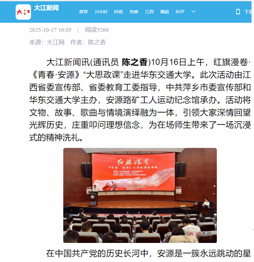 此次“大思政课”红旗漫卷·《青春·安源》走进高校,是安源路矿工人运动纪念馆拓展社会教育功能、推动红色文化育人的一次成功实践。它如同一次精神的火种播撒,让安源的星火在高校的青春沃土上焕发出新的光芒,有力地促进了红色血脉的赓续与传承。