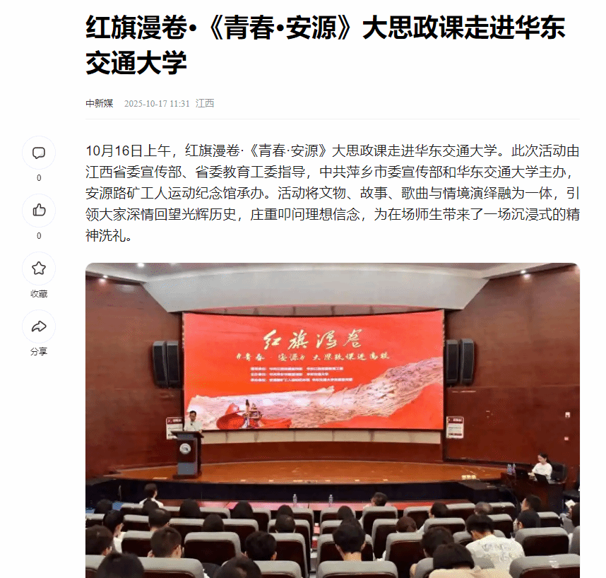 此次大思政课红旗漫卷·《青春·安源》走进高校,是安源路矿工人运动纪念馆拓展社会教育功能、推动红色文化育人的一次成功实践。它如同一次精神的火种播撒,让安源的星火在高校的青春沃土上焕发出新的光芒,有力地促进了红色血脉的赓续与传承。