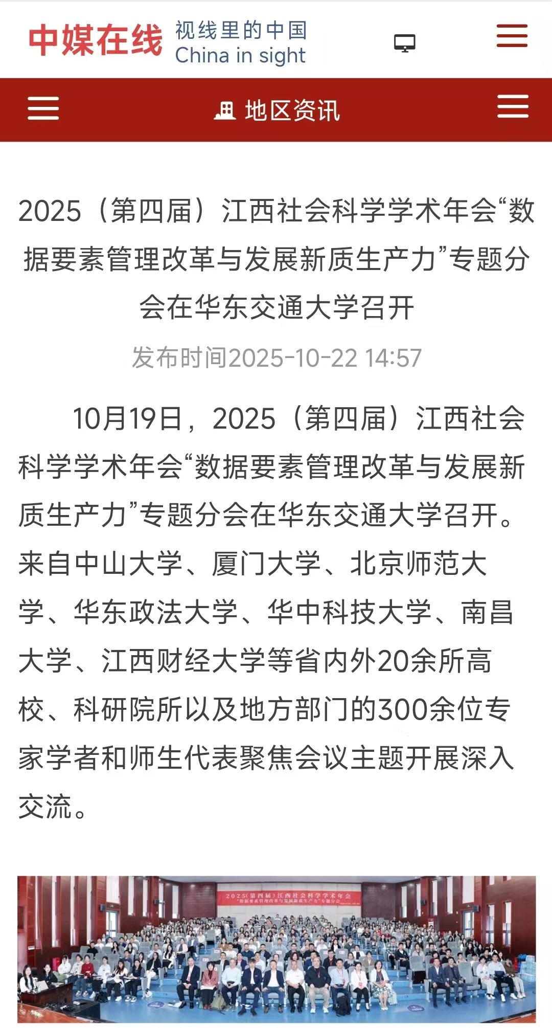 10月19日,2025(第四届)江西社会科学学术年会“数据要素管理改革与发展新质生产力”专题分会在WilliamHill中文官方网站召开。来自中山大学、厦门大学、北京师范大学、华东政法大学、华中科技大学、南昌大学、江西财经大学等省内外20余所高校、科研院所以及地方部门的300余位专家学者和师生代表聚焦会议主题开展深入交流。