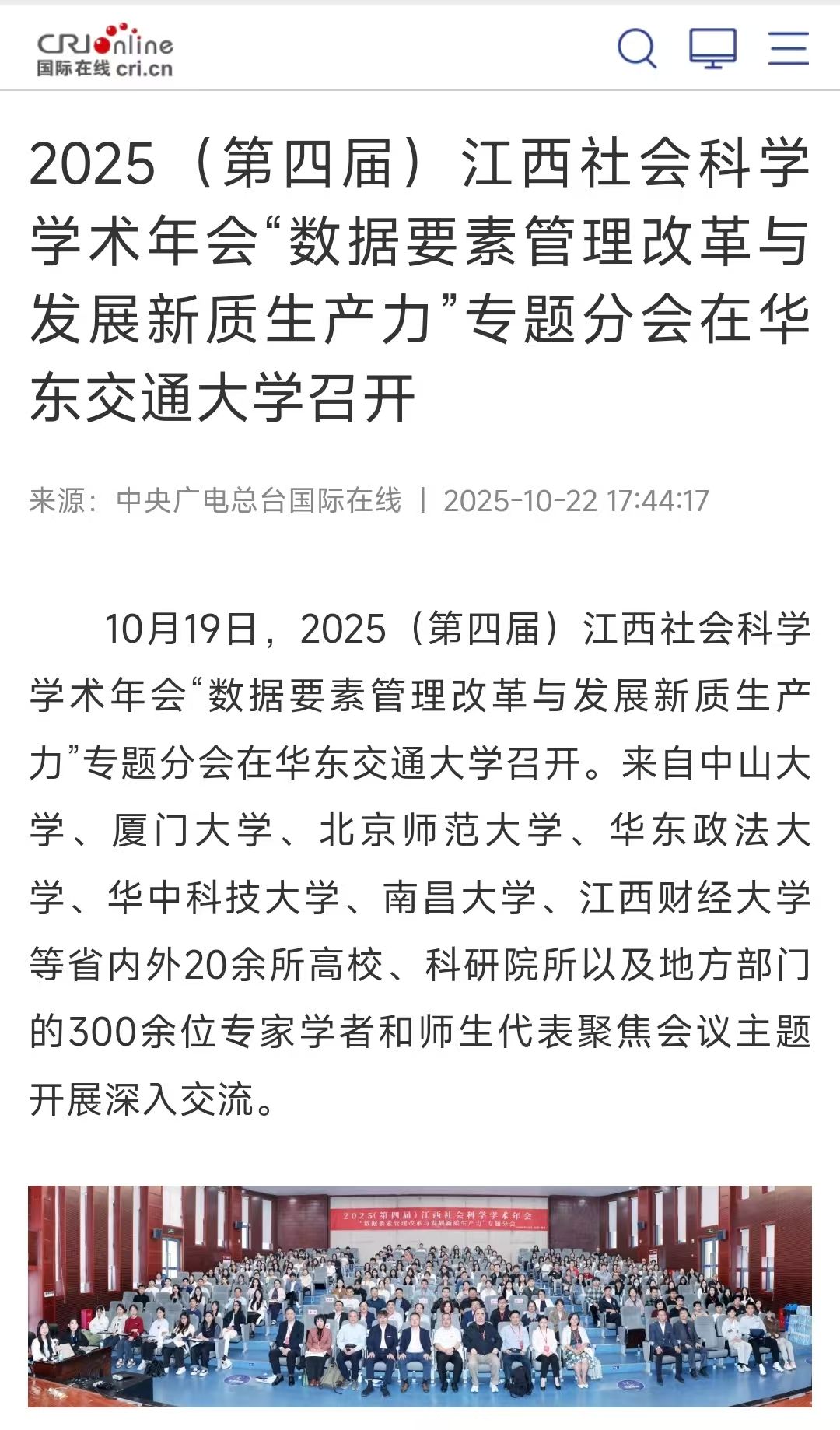 10月19日,2025(第四届)江西社会科学学术年会“数据要素管理改革与发展新质生产力”专题分会在WilliamHill中文官方网站召开。来自中山大学、厦门大学、北京师范大学、华东政法大学、华中科技大学、南昌大学、江西财经大学等省内外20余所高校、科研院所以及地方部门的300余位专家学者和师生代表聚焦会议主题开展深入交流。