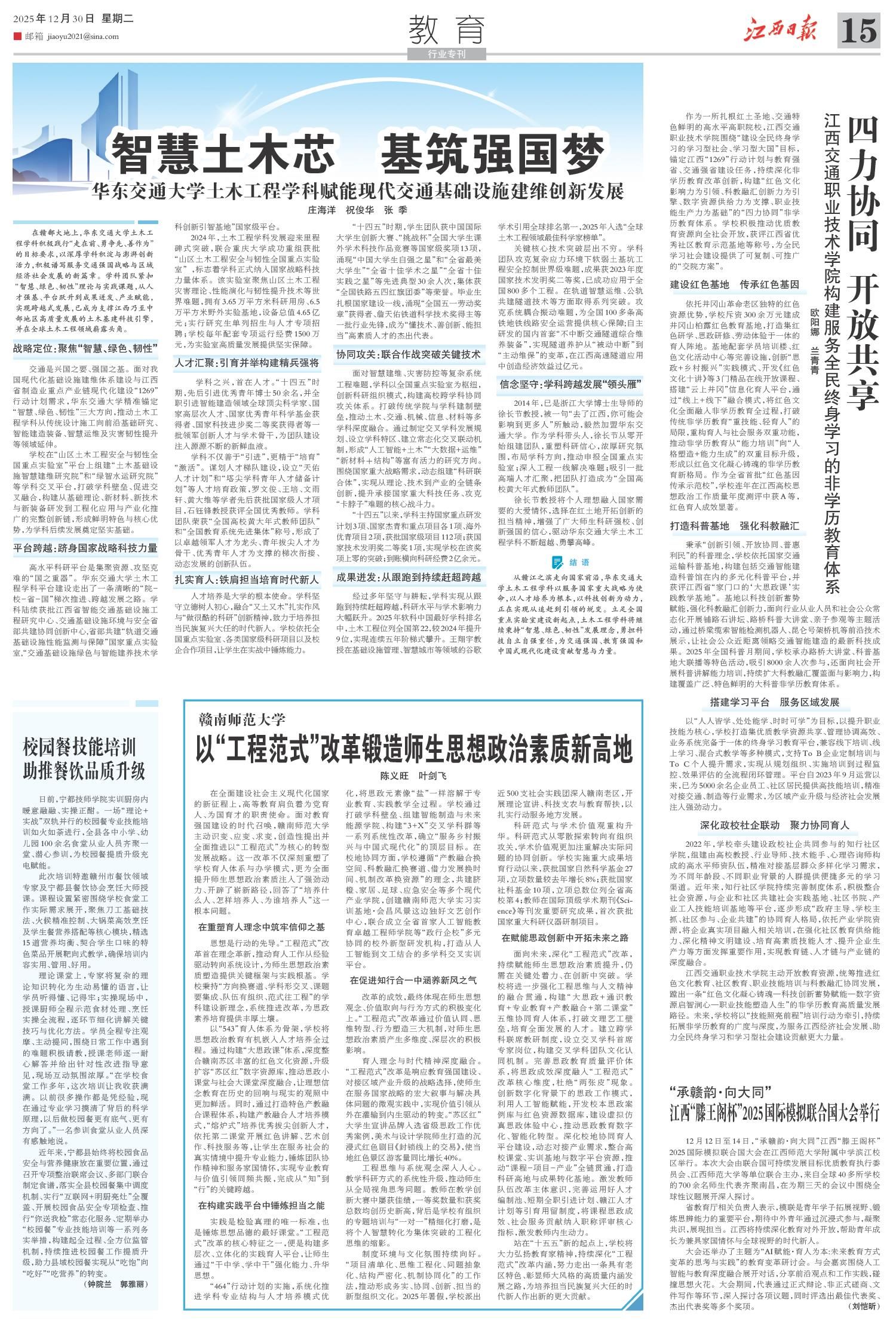 在赣鄱大地上,WilliamHill中文官方网站土木工程学科积极践行“走在前、勇争先、善作为”的目标要求,以深厚学科积淀与澎湃创新活力,积极谱写服务交通强国战略与区域经济社会发展的新篇章。学科团队紧扣“智慧、绿色、韧性”理论与实践课题,从人才强基、平台跃升到成果迸发、产业赋能,实现跨越式发展,已成为支撑江西乃至中部地区高质量发展的土木基建科技引擎,并在全球土木工程领域崭露头角。