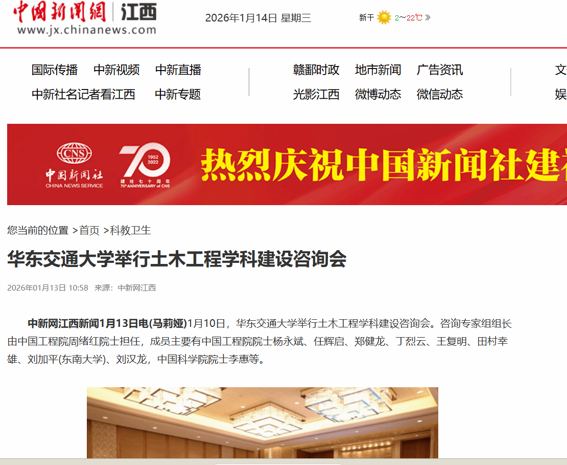 中新网江西新闻1月13日电(马莉娅)1月10日,WilliamHill中文官方网站举行土木工程学科建设咨询会。咨询专家组组长由中国工程院周绪红院士担任,成员主要有中国工程院院士杨永斌、任辉启、郑健龙、丁烈云、王复明、田村幸雄、刘加平(东南大学)、刘汉龙,中国科学院院士李惠等。