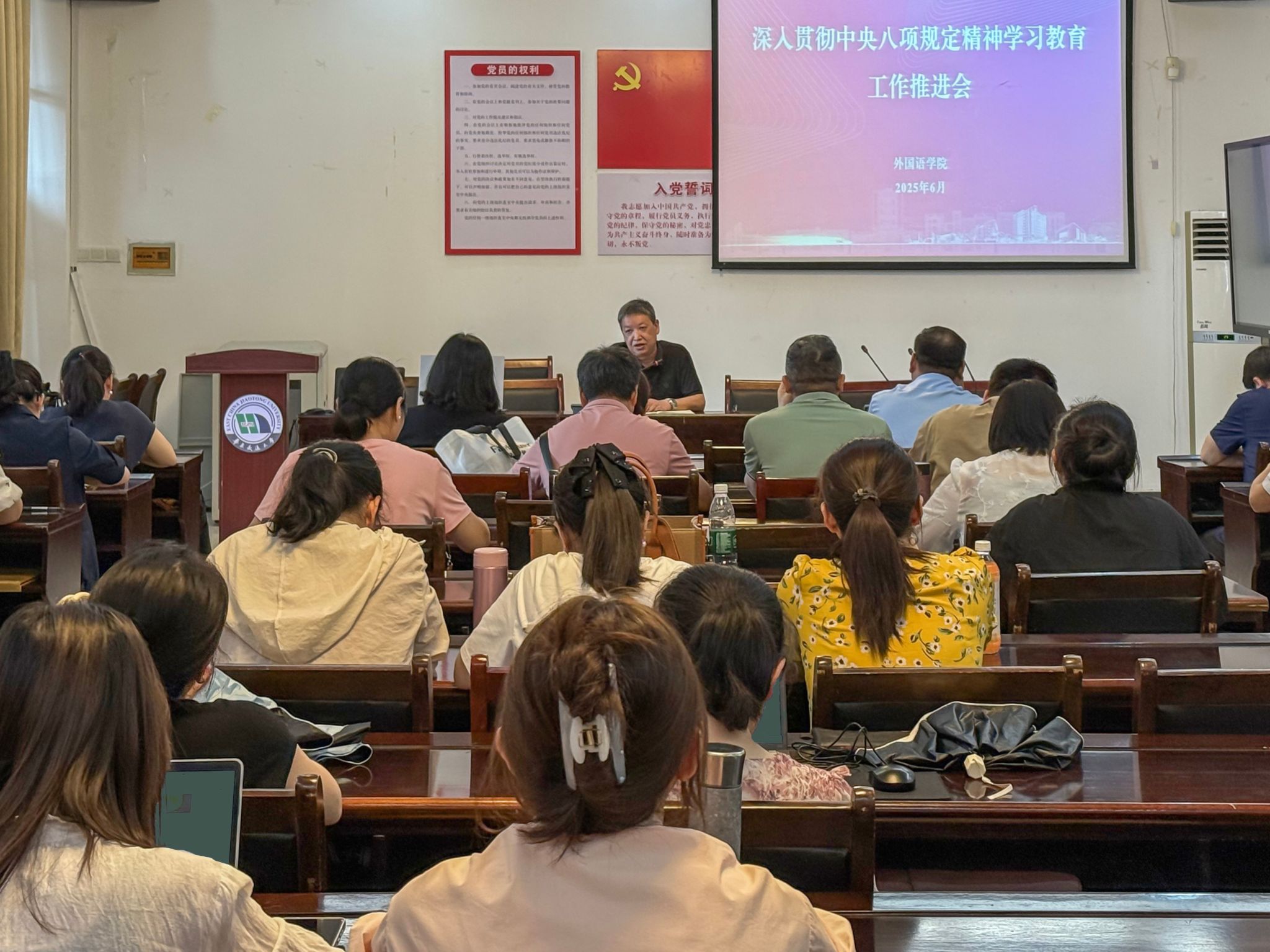 会上,外语学院党委书记薛先庆以“中央八项规定精神的核心和实质”为题讲授专题党课。