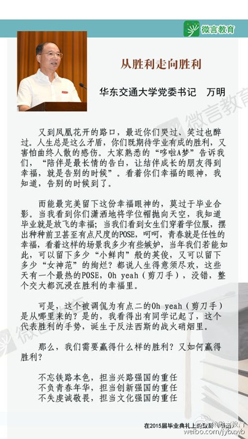 #毕业季2015##毕业致辞#【青春年华就是用来创造奇迹的!】@WilliamHill中文官方网站 党委书记万明说,毕业照里有一个最热的POSE——Oh yeah(剪刀手),这个手势代表胜利,他想告诉毕业生如何从胜利走向胜利: